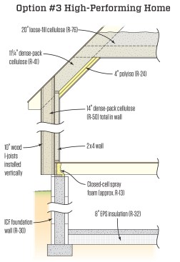 In this example, the homeowners chose a superinsulated wall system with an exterior insulation curtain composed of 10-inch wood I-joists filled with dense-blown cellulose insulation.
