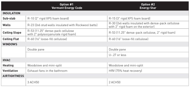 I use four benchmark levels of efficiency for my comparison modeling: the Vermont Residential Building Energy Code, Energy Star (with some upgrades to meet Efficiency Vermont’s Base Level Certified Home), Efficiency Vermont’s High Performing Certified Home, and Passive House Institute US Certified Passive House. These four levels make sense for my area but could differ by region. The efficiency specs and how I planned on satisfying them for this project are presented in the tables on the following pages.