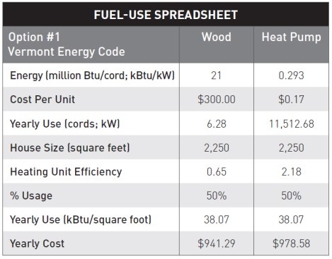 The final step is combining the construction cost estimates and heating cost estimates to calculate payback periods. I use a spreadsheet for this (see facing page). I don’t attempt to account for energy cost inflation because energy prices move up and down seasonally and year to year.
