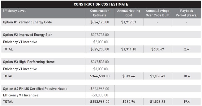 Each level of efficiency will involve different wall assemblies, different size heating systems, a different ventilation approach, and different windows, each with different labor and material costs. On this project, Options #1 and #2 were similar, while Options #3 and #4 had big differences. To achieve the Passive House heating demand, Option #4 required more windows on the south and more insulation, which meant a different wall construction.