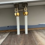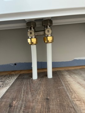 The tubes rise through the subfloor, 2 inches on-center and directly under the centerline of each radiator. They connect to dual isolation valves, as shown in the photos in the slideshow above. These valves allow each radiator to be isolated from the remainder of the system and even disconnected if ever necessary. A split escutcheon plate snaps in place over the piping penetrations.