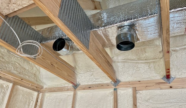 Trunk ducts insulated with bubble foil wrap to prevent condensation transition to 6-inch round branch ducts routed through the spaces between lower truss cords.