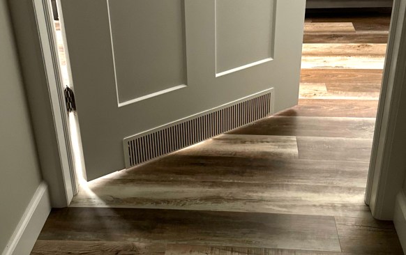 Return air grilles in bedroom doors allow return airflow from all rooms while attenuating sound and light transmission.