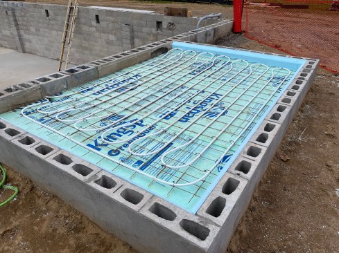 After the stem walls were constructed, we filled the enclosed area with granular soil, compacted it, and covered it with a 6-mil poly vapor barrier and 2 inches of extruded polystyrene. Tubing for floor heating was fastened to the 6×6 WWF (welded wire fabric) reinforcement, and a 4-inch concrete slab was poured flush with the top of the stem walls.