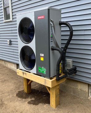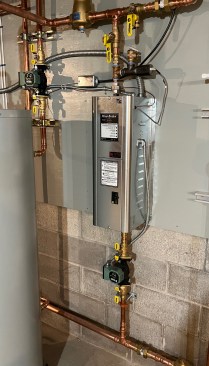 We planned for the project’s HVAC system to be all-electric. A SpacePak iLAHP air-to-water heat pump with a nominal 4-ton (48,000 Btu/hr) heating capacity is the primary heat source, and a 9-kilowatt (30,700 Btu/hr) Electro Industries electric boiler provides supplemental and backup heating.
