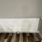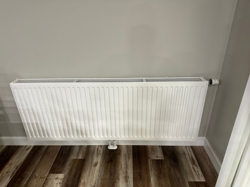 The lead diagram and one of the photos in the slideshow above show the panel radiators. The knob of the thermostatic radiator valve is at the upper right corner of the radiator, and the 1/2-inch PEX-AL-PEX supply and return tubes are at the bottom center. The two floor heating circuits use a thermostatic valve body connected to a wall-mounted setting dial via a capillary tube.