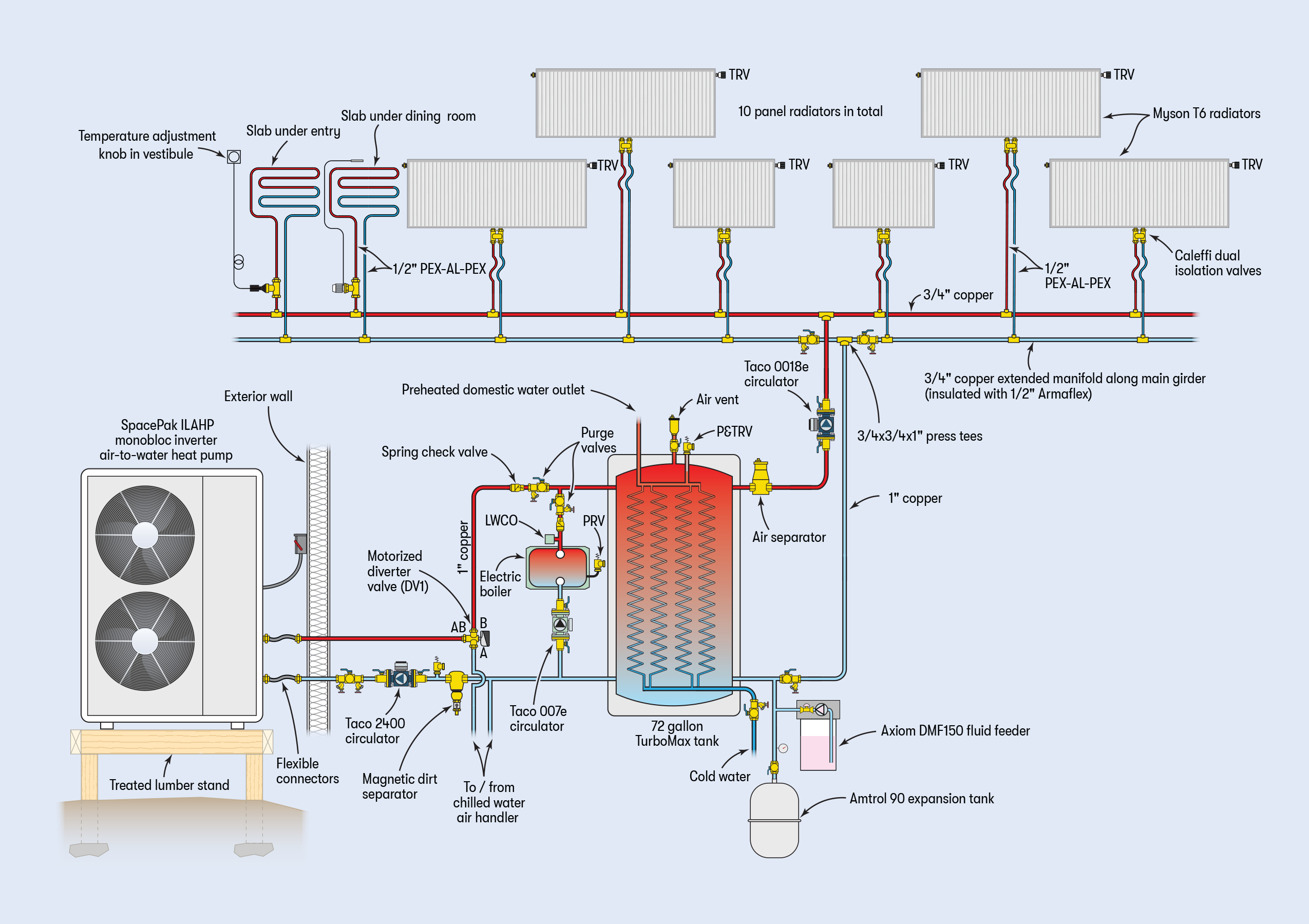 The heat pump maintains the water temperature between 100°F and 110°F within a Thermo 2000 TurboMax reverse indirect water heater tank. This tank—described later—also serves as a buffer tank for a highly zoned hydronic distribution system consisting of 10 Myson T6 panel radiators and two small areas of floor slab heating.