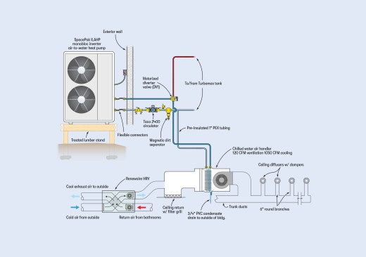The air-to-water heat pump also supplies chilled water for cooling. That water is delivered to a hydronic air handler located within conditioned space between attic trusses. The diagram below shows the cooling portion of the system.