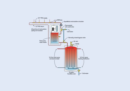 The air-to-water heat pump is piped in parallel with the electric boiler. Either one can serve as the system’s sole heat source, or both can operate simultaneously if the water temperature in the TurboMax tank drops 5°F below its normal cycling range. The heat pump and boiler are turned on and off using a Tekmar 152 two-stage temperature setpoint controller that continually monitors the tank temperature. This controller prioritizes the heat pump as the “lead” heat source.