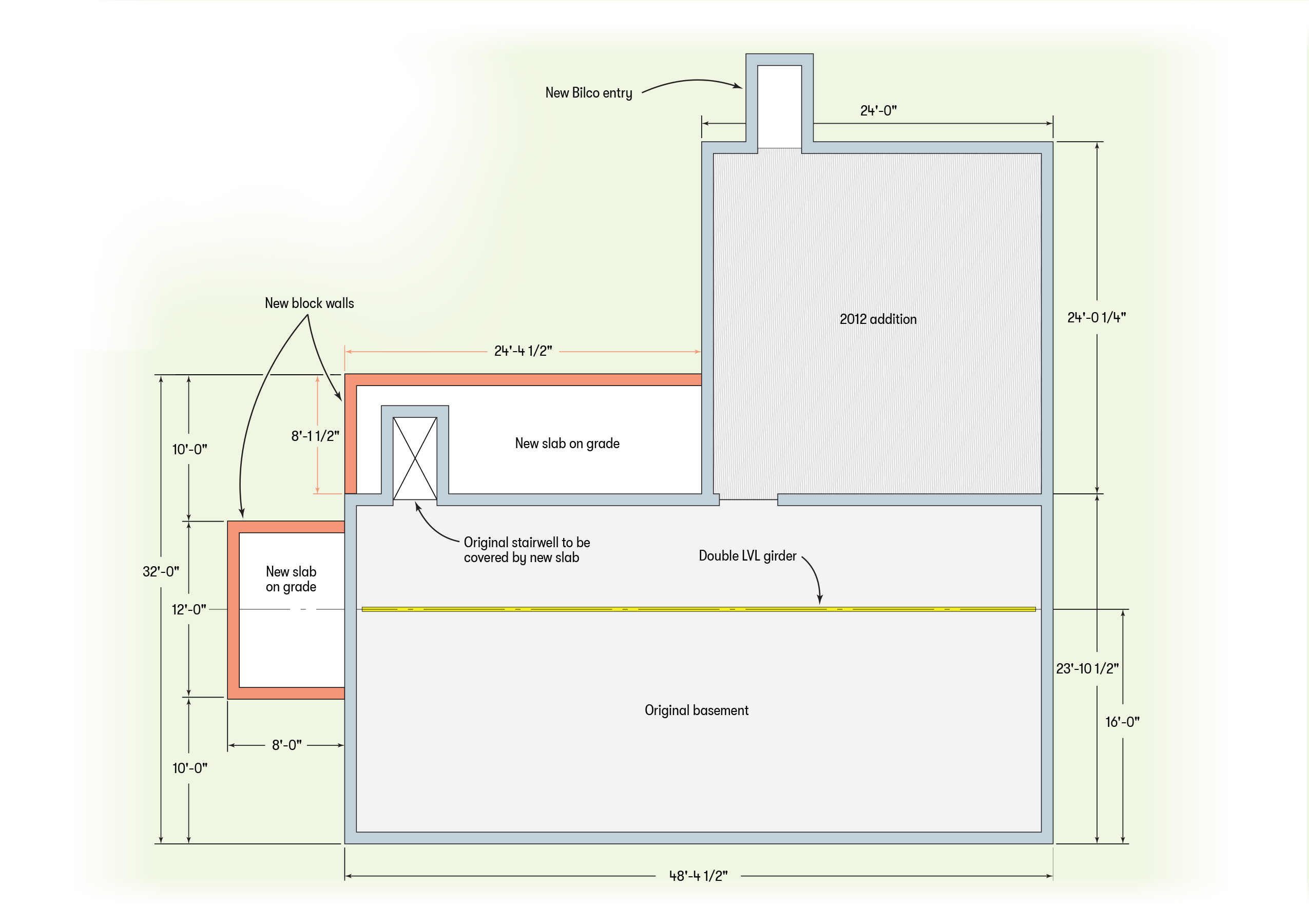 The original 24×48 basement and a later 24×24 addition are outlined in grey in the floor plan below. We cut a Bilco entryway into the existing basement wall and added two small slab-on-grade “appendices” (outlined in orange)—one to extend the width of the main foundation out to 32 feet, and the other to support a small entry vestibule. Both appendices were constructed using a shallow frost-protected foundation system, as shown in the illustration and photos below.