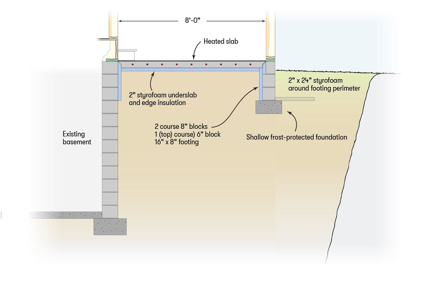 The new foundation areas are protected from frost damage by a shallow foundation with rigid foam around the footing perimeter.