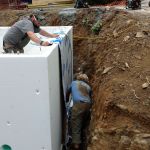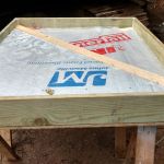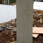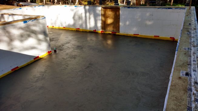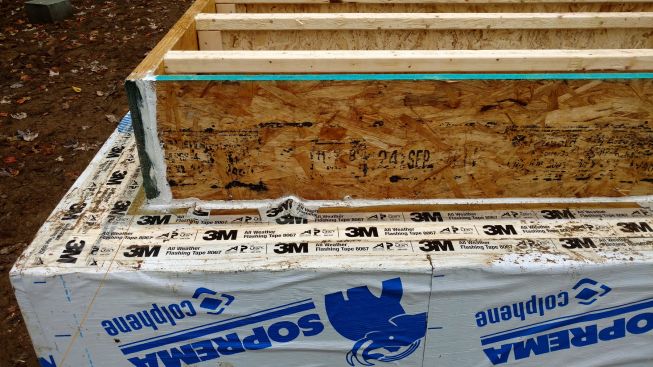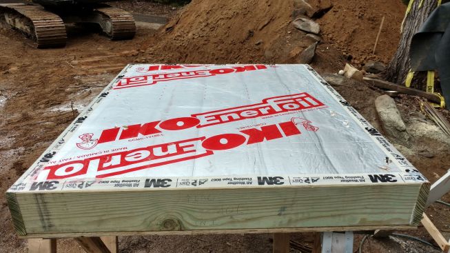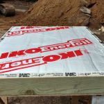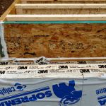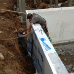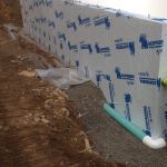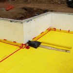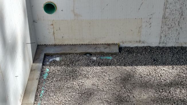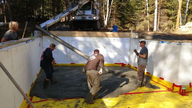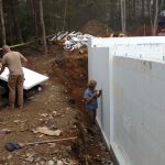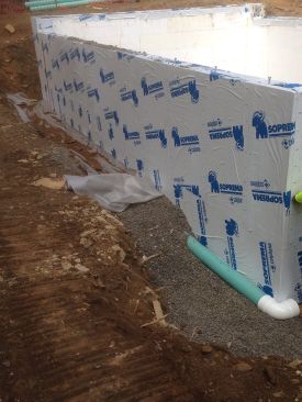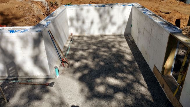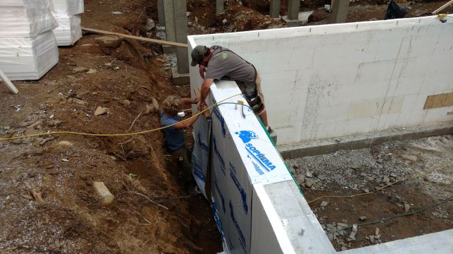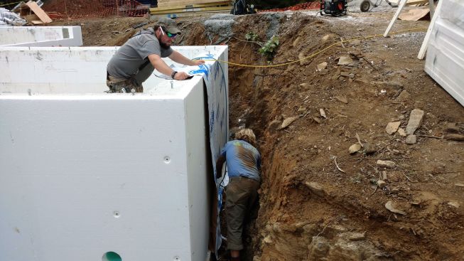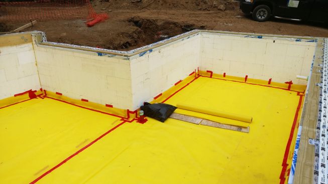 The crew augmented the 2.5-inch ICFs with another 3 inches of expanded polystyrene (EPS) foam insulation, attached on the outside of the foundation using 4-inch R4 GRK screws and inch-and-three-quarter plastic washers. They installed perimeter foundation drainage on both the inside and the outside of the foundation at footing depth, connecting the interior drain tile with a vent stack for radon control. The interior drains were also equipped with backflow preventers, allowing drainage if needed, but limiting inflow of air or water. After installing a layer of compacted crushed stone, the crew applied a layer of 16-mil sub-slab poly, sealed with tape at the seams and taped to the face of the ICFs. Then, a concrete contractor placed the basement slab.