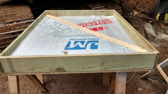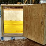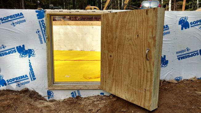 To complete the airtight, superinsulated basement wall, the crew constructed a 6-inch-thick insulated basement door, with double-gasketed stops and heavy-duty hinges.