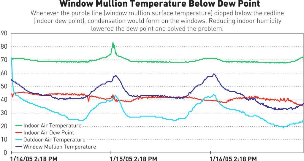 We set up recorders to measure indoor temperature, indoor humidity, outdoor temperature, and using the remote temperature sensor, the temperature of the window frame. When the next cold snap hit, we were able to show that the inside surface of the window frames was below freezing when the outdoor temperature dropped below 20° F. Using the built-in features of the Onset software, we could show that the window frames dropped below dew point, even when outdoor temps were above freezing (see graph, above).