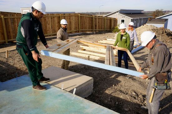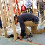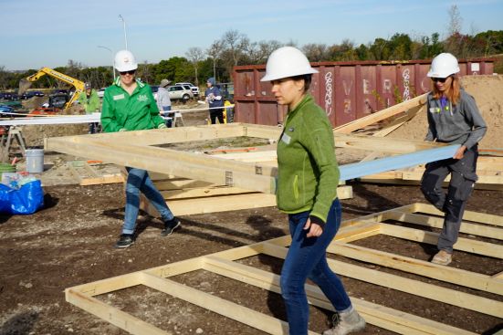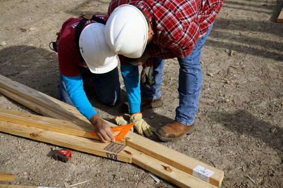 “It also takes the knowledge needed to frame walls out of the on-site work,” Whipple notes. “It’s one staff person at the warehouse that does all the layouts, all the takeoffs, and figures everything out. He frames the walls there with one volunteer helper. When we bring it out to site, everything’s labeled. The plans are labeled, we chalk the slab, label where every wall goes, and then it becomes very volunteer-friendly at that point. You just gotta match the numbers and letters up, and it goes together pretty smooth from there.”