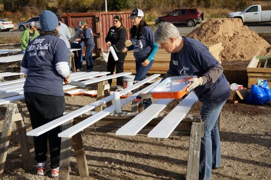 The project we visited was an 18-day “blitz build.” By the third day, the site was a beehive of activity, with volunteers busy on all sides of the building installing Hardie Panel siding and Hardie trim, installing and flashing windows, and sheathing roofs and gables.