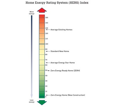 ZERH homes are designed to achieve a HERS (Home Energy Rating System) score of 50 or less, which is at least 50% more efficient than a standard reference home, and about 25% more efficient than the average Energy Star certified home (see image below). Builders of ZERH homes are eligible for the 45L federal tax credit of $5,000 per unit.