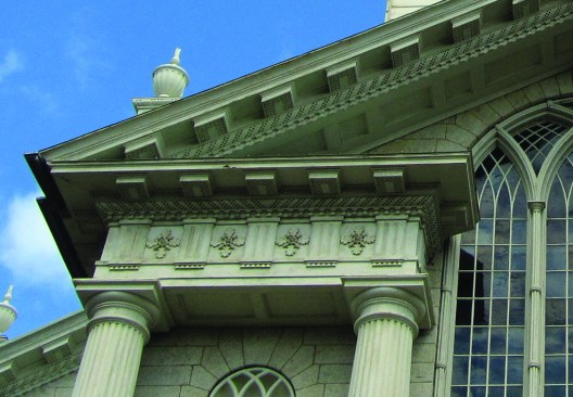 Begin your tour at 1 Benevolent Street, at the First Unitarian Church (1816). Its facade is a study unto itself of the Classical orders that Benjamin illuminates in the first pages of his treatise; at each level, the columns step up (in order from bottom to top) from Doric to Ionic to Corinthian. Designed and built by master-builder/architect John Holden Greene—back when there was no distinction between the professions—the church resembled New South Church in Boston (1814), which was modeled after London’s St. Martin in the Fields (1726). What Greene brought that was unique—and appropriate for a congregation that embraced the idea of “universalism”—was a blending of architectural styles, not only in the ascending columns and pediments, but in the windows’ Gothic tracery combined with ancient Roman arches.