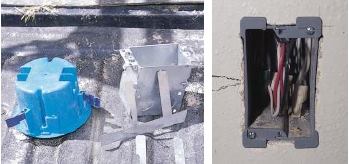 A. Remodel boxes, or remodeler straps, also called “chicken legs” or “turkey legs” (Figure 4), are helpful for putting new boxes in old walls. The remodel boxes come in plastic or metal. The plastic ones have ears that lie flat against the box as you place the box into a hole in the wall. Then, by turning screws from the front of the box, the ears turn out from the box and catch the inside of the wall. This places pressure from behind the box, and the flange on the front of the box holds the box firmly in place. The metal version works on the same principle, but will not flex or distort as the plastic box can.