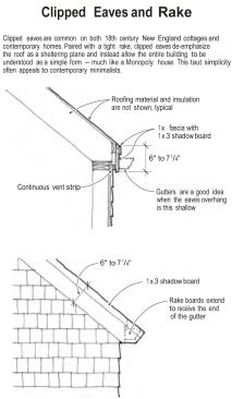 Likewise, clipped eaves generally work well with a clipped rake — an overhanging rake with clipped eaves might appear somewhat awkward. On the other hand (here’s an exception), a clipped rake can work with extended eaves.