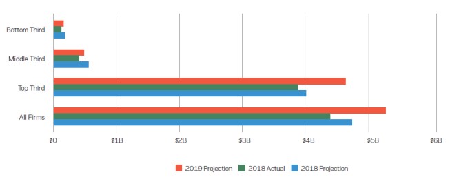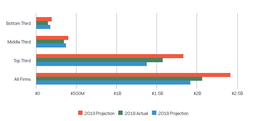 Full-service firms did rather well at meeting expected goals, with all firms on average exceeding projected revenue figures. Those in the top third did better, far exceeding their goals, which brought up the average; the lower two-thirds didn’t quite meet their projections. However, for 2019, there is enormous optimism, with all firms projecting a 17% increase in revenues.