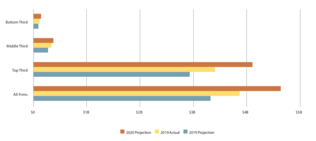 Full-Service Firms. Due to varied participation related to the coronavirus pandemic, only projected and actual revenue figures from firms who participated in both 2019 and 2020 are represented below. Among this cohort, full-service firms outperformed projections in 2019. On average, firms earned over 7% more revenue in 2019 than projected, with the top third of full-service firms earning almost 10% more than projections. Firms anticipate revenue growth to expand further in 2020, though many of the projections likely do not account for the effect of COVID-19 on business.