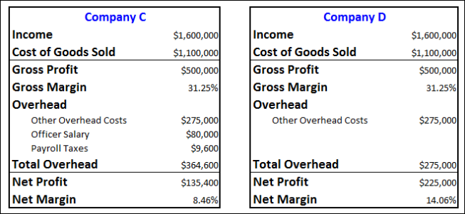 Finally, let’s consider tax structure. Company C is structured as an S Corporation. There is one officer compensated via a salary of $80,000. Company D is structured as a single-member LLC and the member receives $80,000 via draws. Keep in mind that member draws do not appear on the profit and loss statement but are classified as equity accounts appearing on the balance sheet instead. The net margin for Company D is just over 14%, while that of Company C is less than 8.5%. Does that mean that Company D is really more profitable? Actually, these companies are identical.