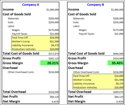 Company A classifies workers’ comp insurance, liability insurance, the cost of company production vehicles, and field workers’ paid time off as COGS, while Company B classifies these as overhead. As a result, their respective gross margins are completely different; A’s is 28.21% while B’s is 35.4%. But if you check the net margin, they both show the same: 6.41%.