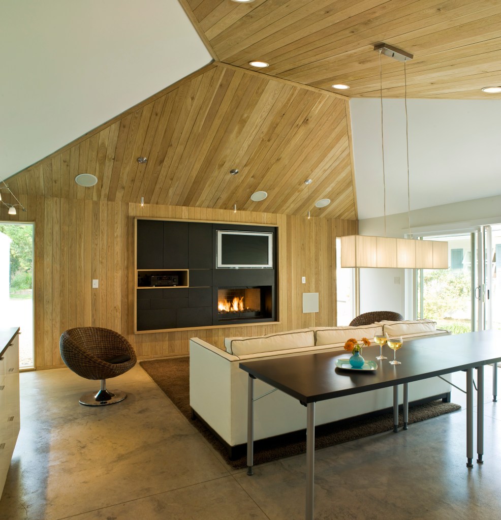 By enclosing the garage door side of the building and removing the ceiling joists, the firm was able to create the wood-slat focal wall that works its way up the ceiling to a hip roof. A slate-faced entertainment center was added to the middle of the wall, with a flat screen television and a stereo system. In order to install a gas fireplace under the TV, Snider and his team had to bump out the wall behind the entertainment center to house the flue.