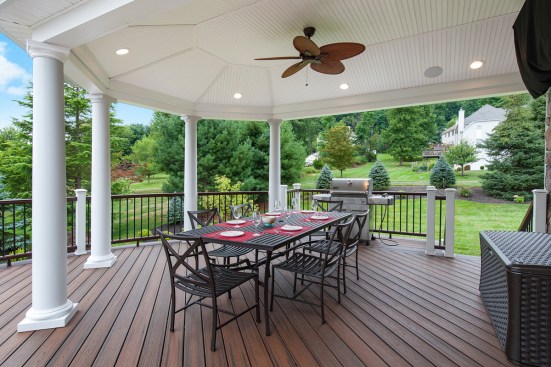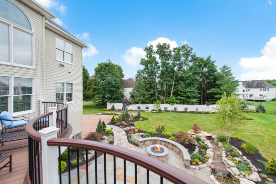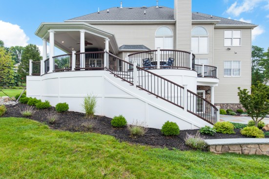 Bill Wilson, co-owner of Amazing Decks, designed a composite deck that “married the house to the yard.” It features a covered dining area with a television, a smaller uncovered dining space, and a curved staircase that leads to a patio with a fire pit and small waterfall.