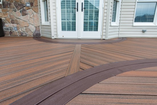 Synthetic deck boards were chosen for this large-scale project because of their low maintenance. In the design, Wilson used variegated boards in circular patterns to designate the differing sections of the deck. This also made the outdoor flooring feel like the indoors.