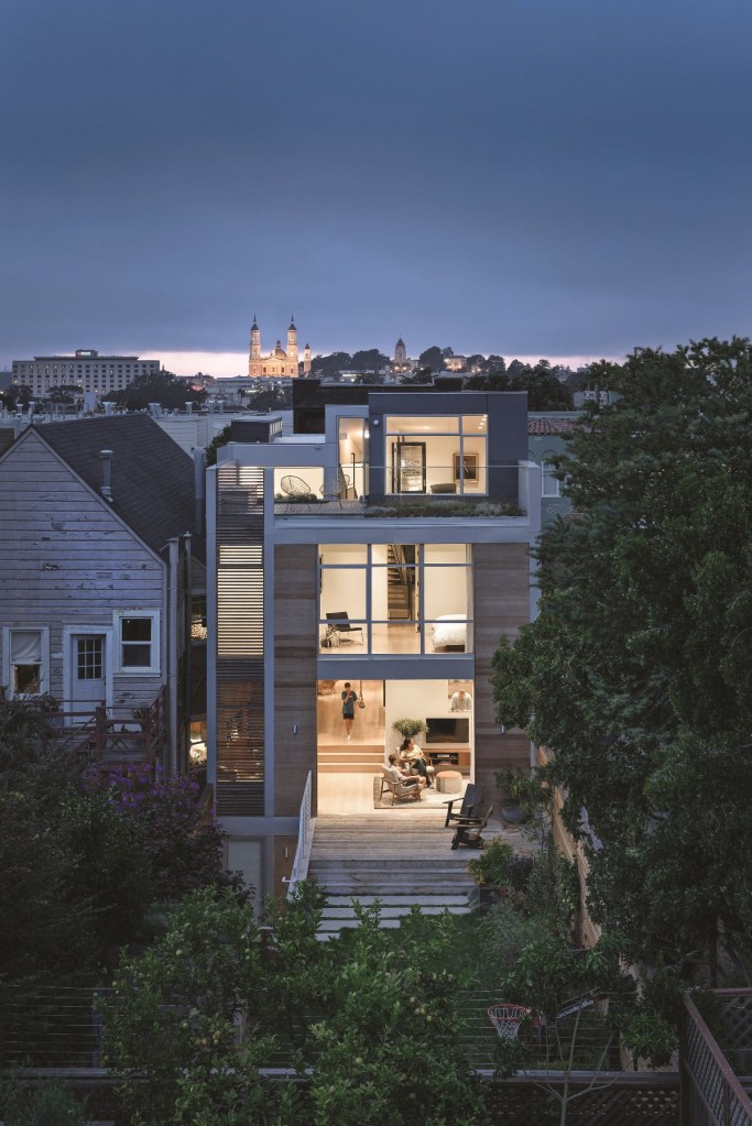 Architect Jonathan Feldman did that by opening up what was a traditional San Francisco townhouse. The main floor combines kitchen, dining, and living spaces into a great room area that becomes even greater with a two-story tall kitchen and a living area that flows out onto an outdoor deck and backyard.