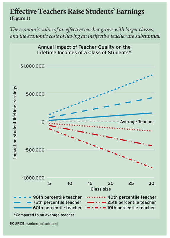 The magnitude of variation in the quality of teachers, even within each school, is startling. Teachers who work in a given school, and therefore teach students with similar demographic characteristics, can be responsible for increases in math and reading levels that range from a low of one-half year to a high of one and a half years of learning each academic year.