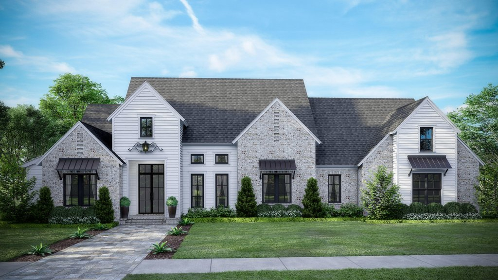 You won’t guess that this is a one-story plan from the grand exterior. Sleek metal awnings add farmhouse flair.