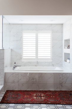 Tiled bathroom aprons. Tile is a cheap material that can update and transform a bathroom. Houzz is seeing many homeowners and designers order extra tile to wrap the tub apron. Designers are also achieving the same effect by wrapping tub aprons with materials such as wood.