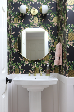 Fully wrapped, bold powder rooms. Using bold style choices in powder rooms is not a new trend. However, a fresh way designers and homeowners are going big in powder rooms is by wrapping the entire space in a feature wallpaper or other similar material.