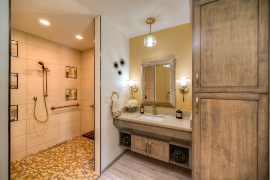 Bonnie Lewis, Allied ASID, Associate IIDA, CAPS, owner of 55+ TLC Interior Design LLC in Scottsdale, Ariz., was honored with an award in the Major Space Remodel category. The award-winning remodel was of the first floor of a home. The client wanted his 90-year-old parents, who have dementia, to move in with him. Lewis created an ADA-compliant master suite, bathroom, wardrobe, and hallways for the parents’ living space. She also raised the sunken living room to help eliminate fall risks.