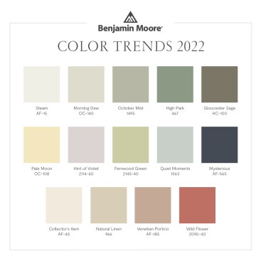 “As the spaces in our homes continue to evolve, we uncover more opportunities to express our individuality and leverage the power of color to design environments that serve different functions and styles,” says Andrea Magno, Benjamin Moore’s director of color marketing and development. “October Mist 1495 and the corresponding Color Trends 2022 palette reflects an effortless harmony of colors, while inspiring unique combinations for any paint project.”