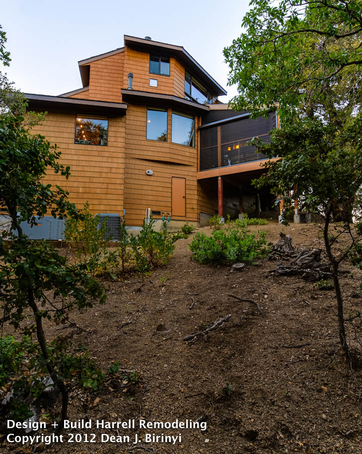 The catio is a place where the cats can safely enjoy the outdoor area. Even though the house has other decks, this one is just for felines. Since the home is in the wooded hills of California, there are mountain lions and other predators that pose danger. Special pet mesh and scratch-resistant screens keep the cats in and the predators out. The screens are also motorized so that they can be raised when the cats aren’t outside, allowing the owners to enjoy the full view. Jorgensen says finding the cat-proof screens was the most challenging part of this project.