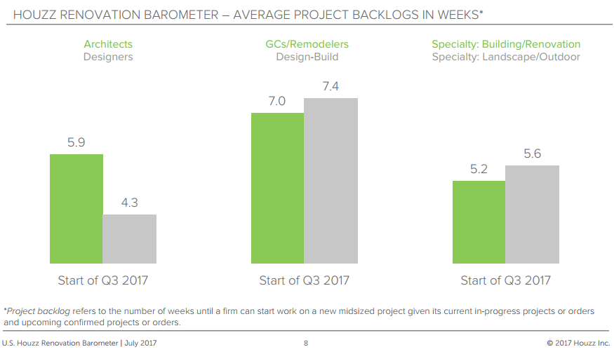 With all industry groups reporting increased market activity in the second quarter of 2017, the remodeling platform Houzz has added a new metric to their quarterly report, the Houzz Renovation Barometer Backlog Index, which details the average number of weeks until a firm could start work on a new mid-size project given its current commitments.