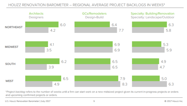 Although GCs/remodelers and design-builds seem to be the busiest in all areas of the country, the regional averages for the backlogs vary. In the Northeast, remodelers report an average 6.4-week backlog, while design-builds have an average of 7.7. In the West, the longest delays out of all regions and groups exist with a range of 7.9 weeks to 8.3 weeks for remodelers and design-build companies.