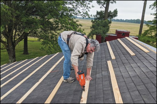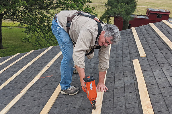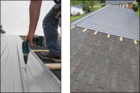 Our company, Miiller Construction, installs a lot of exposed-fastener metal roofs. Most of these are reroofs on homes, which we typically install over existing asphalt shingles. All of the commercially available metal roofing we can buy in our area is warranted for contact with asphalt, but we prefer to install 3 1/2-inch wood strapping first, securing it through the shingles to the sheathing with ring-shank nails. This gives us a firm base for the screws that hold down the roofing. Many of the older roofs in our area are decked with board sheathing. With a nail gun, it’s obvious when you miss a solid board, and you can just fire in another nail. But if you are screwing the roofing directly to the shingles and hit a dead space, you need to back the screw out and fill the hole with a grommeted stitch screw. All the extra holes in the metal makes for more risk than we care to take on. It also takes longer.