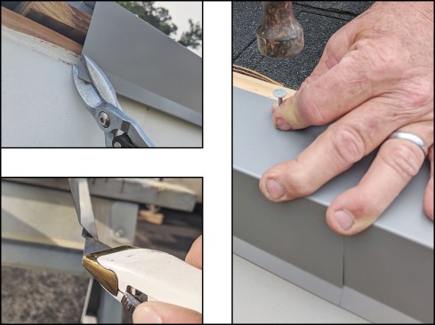 We start installing the trim from the bottom and work our way up, just as we do with the roofing panels, so that the lap drains water away with gravity.