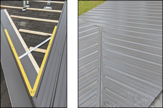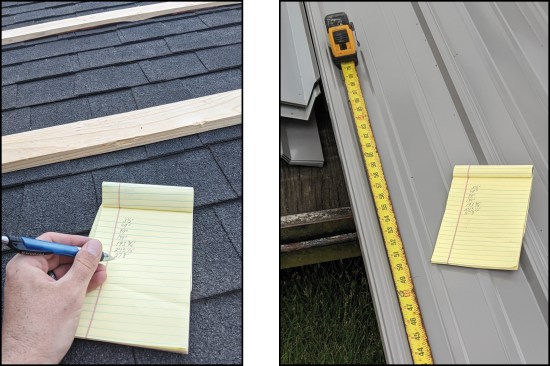 On a house, we normally install lath every 2 feet. More is not needed; there’s no reason to drill extra holes through the roofing panels. But it’s key that you know where your holes go. We measure the distance to the center of each lath and write those numbers down (left). We can then transfer these numbers to a panel (right).