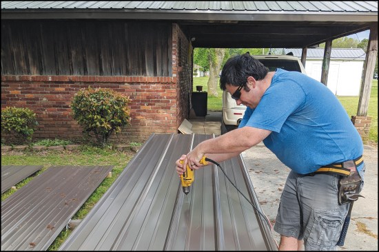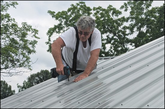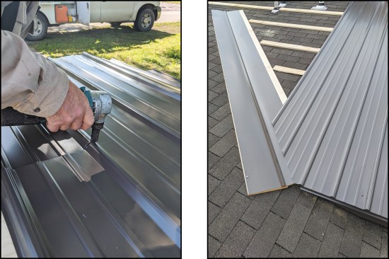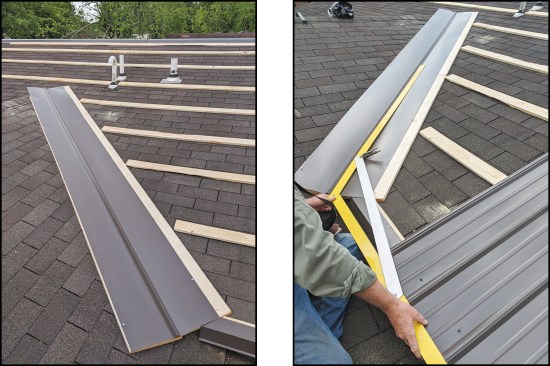 We place screw holes in the center of the pan, just to the right of the rib, and use 1-inch roofing screws to secure the panels (left). Ridge cap is secured to the ribs of roofing panels with stitch screws for a metal-to-metal connection. Typically, we complete the roof in sections (right) so we don’t have to move ladders around the house multiple times and continually walk back and forth to one work station.