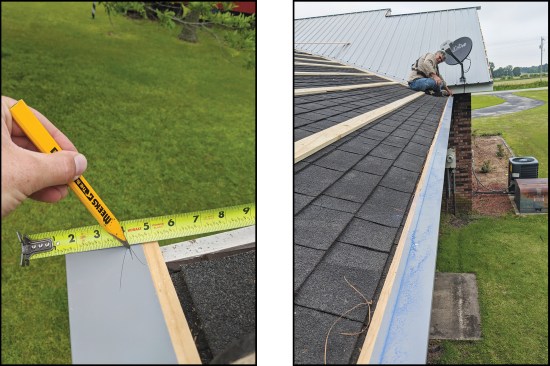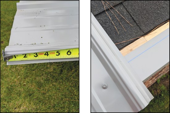 Existing roofs are rarely square, so we use a method for positioning panels that focuses on getting the overhanging edge straight; if the gable edge is off, it will be covered with trim. We start by measuring any distance that allows for the roofing to overhang the eaves trim by 1 1/2 inches and lands on the drip edge—in this case, we chose 4 inches (left). We mark the same distance on the far end of the roof and pop a chalk line (right).
