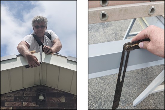 After the roofing panels are installed, we cover the gable edge with rake trim. To find the plumb cut for the trim at the peak, we use a sliding bevel square (left, right); it’s a simple, old-school tool, but it works well.