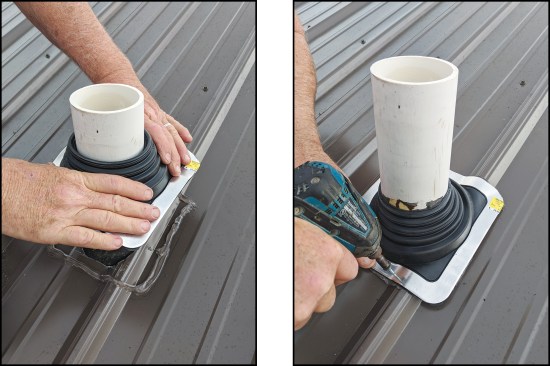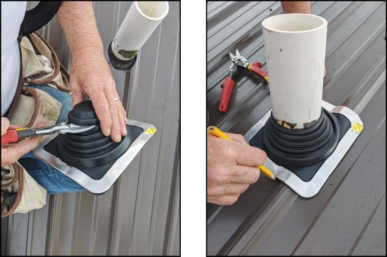 We rough-cut the metal panel around plumbing vents using a metal blade in a jigsaw and rely on a boot to seal the penetration (left). After trimming the rubber to fit the vent, we dry-fit the boot and mark the perimeter (right) so we know where to apply a continuous bead of a solvent-based rubber sealant. (We use a sealant by Sashco; a sealant that stays flexible is critical for metal roofing, which moves a lot with changes in temperature.)
