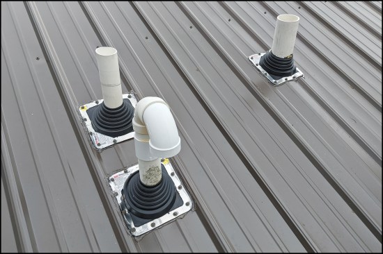 It’s great when the vents fall in the center of the pan, but this doesn’t always happen. The boot (this one is made by Oatey) has a soft aluminum and lead edge that is made to conform to the panel ribs.