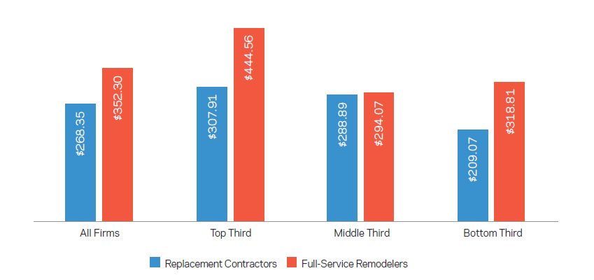 Cost per lead. In 2018, full-service remodelers spent on average 31% more per lead than the average amount spent by replacement contractors. The difference was greatest among the top third, where full-service firms spent 44% more than those in the top third of the replacement category.